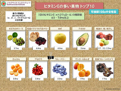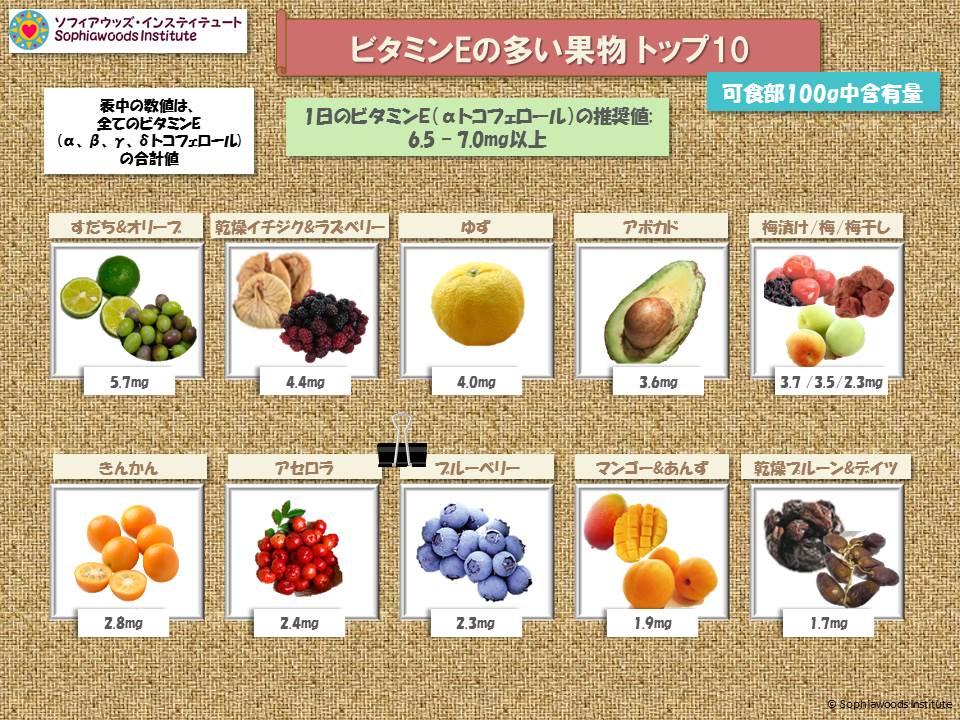 ビタミンEはすだち、オリーブ、乾燥イチジク、ラズベリー、ゆず、アボガド、梅、キンカン、アセロラ、ブルーベリー、マンゴー、あんず、乾燥プルーンなどに。
