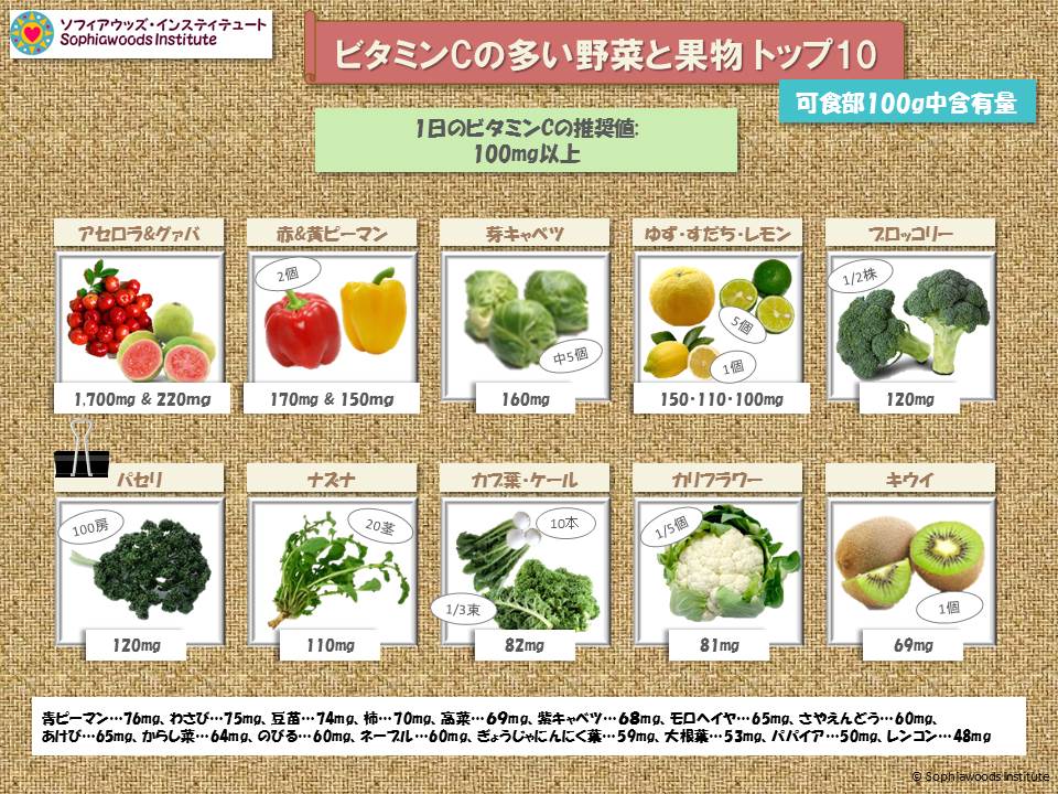 また、ビタミンCはアセロラ、グァバ、ピーマン、芽キャベツ、ゆず・すだち・レモン、ブロッコリー、パセリ、なずな、カブの葉、ケール、カリフラワー、キウイなどにも多くふくまれています。